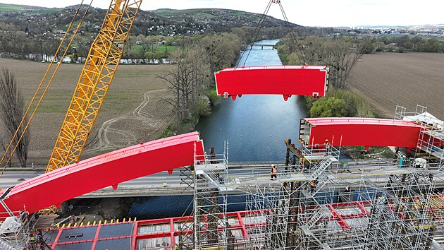 Stavebníci dokončili oblouk unikátního dálničního mostu u Napajedel, který bude součástí dálnice D55. (duben 2025)