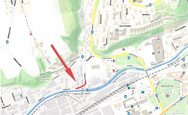 Mapka vyznačuje úsek silnice na ulici Nábřeží ve Zlíně, který město nechá opravit. (říjen 2024)