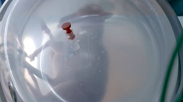 Předčasně narozený plod jehněte uvnitř umělé dělohy vyvinuté výzkumníky z BCNatal ve španělské Barceloně. Snímek z videa pořízeného 19. června 2023