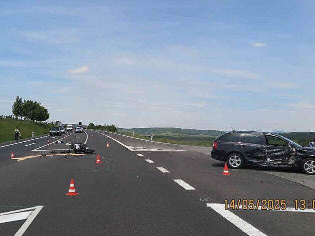 U obce Bánov na Uherskobrodsku došlo k vážné nehodě osobního vozu a motorkáře. (květen 2025)