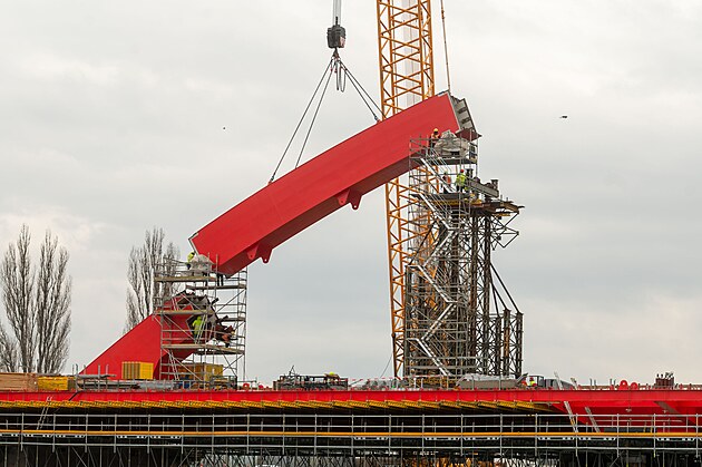 Silničáři u Napajedel dokončují impozantní oblouk mostu přes řeku Moravu. Most je součástí pokračování dálnice D55. (duben 2025)