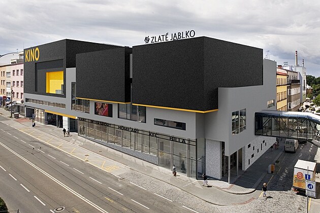Obchodní centrum Zlaté jablko na náměstí Míru ve Zlíně se pustilo do rekonstrukce fasády. (duben 2025)
