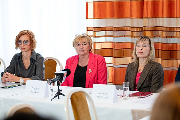 Odbory Krajské hygienické stanice Zlín vyzvaly ředitelku Evu Sedláčkovou k rezignaci. Na snímku uprostřed předsedkyně Odborového svazu zdravotnictví a sociální péče ČR Dagmar Žitníková. (10. října 2025)