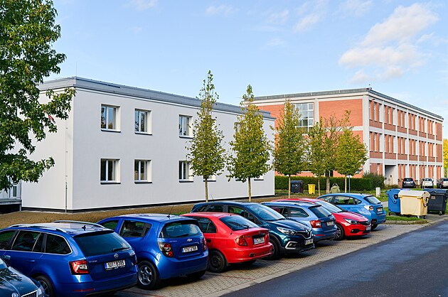 Opravená budova přístavby gymnázia v Otrokovicích září bílou barvou a neladí tak s hlavní budovou školy, která je v klasickém baťovském stylu. (říjen 2025)