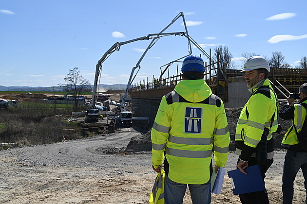 Stavebníci betonují most v Porubě u Valašského Meziříčí, který je součástí Palačovské spojky. (duben 2025)