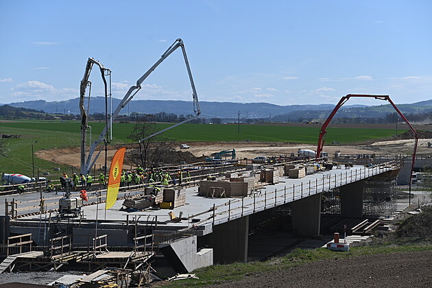 Stavebníci betonují most v Porubě u Valašského Meziříčí, který je součástí Palačovské spojky. (duben 2025)