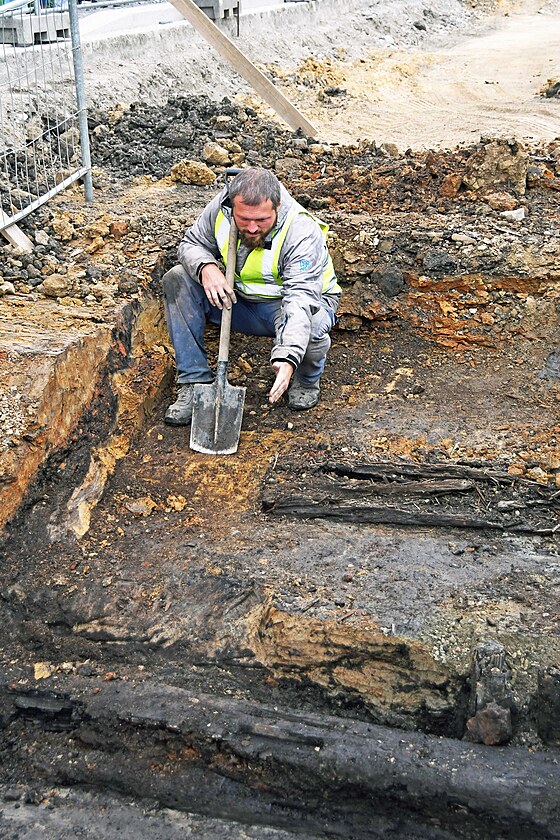 Archeolog Samuel Španihel při průzkumu rekonstruovaného náměstí ve Valašském Meziříčí. (květen 2022)