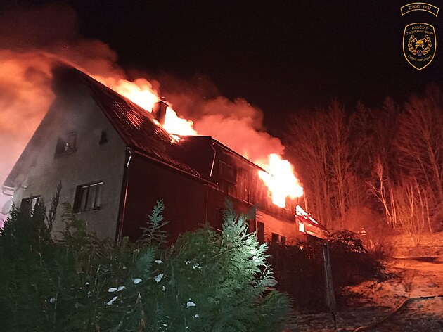 Likvidaci požáru rodinného domu v Prostřední Bečvě komplikovala zledovatělá silnice. (leden 2025)
