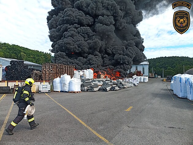 Na dvoře areálu firmy v Ludkovicích hořely plasty. (25. června 2025)