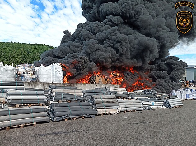 Na dvoře areálu firmy v Ludkovicích hořely plasty. (25. června 2025)
