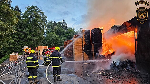 Hasiči likvidují požár pily ve Velkých Karlovicích na Vsetínsku. (17. června 2025)