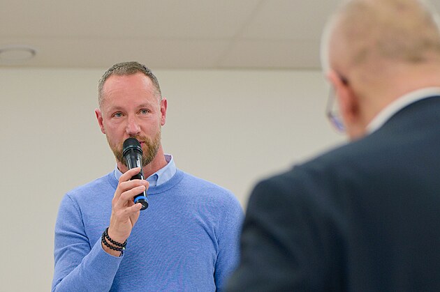 Ministr školství Mikuláš Bek se v Liptále na Vsetínsku setkal se starosty obcí, kterým se nelíbí návrh ministerstva na změnu financování nepedagogických pracovníků škol. Na snímku starosta Luhačovic Marian Ležák. (únor 2025)