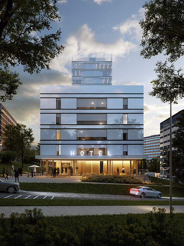 Budovu banky na náměstí Práce ve Zlíně má nahradit komplex dvou budov nazvaný Prospect. (duben 2025)