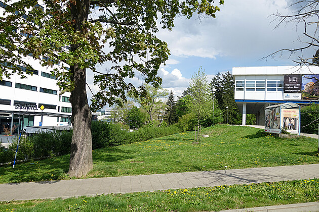 Budova bývalé bankovní pobočky u náměstí Práce ve Zlíně, místo níž má vyrůst nový komplex budov Prospect. (duben 2025)