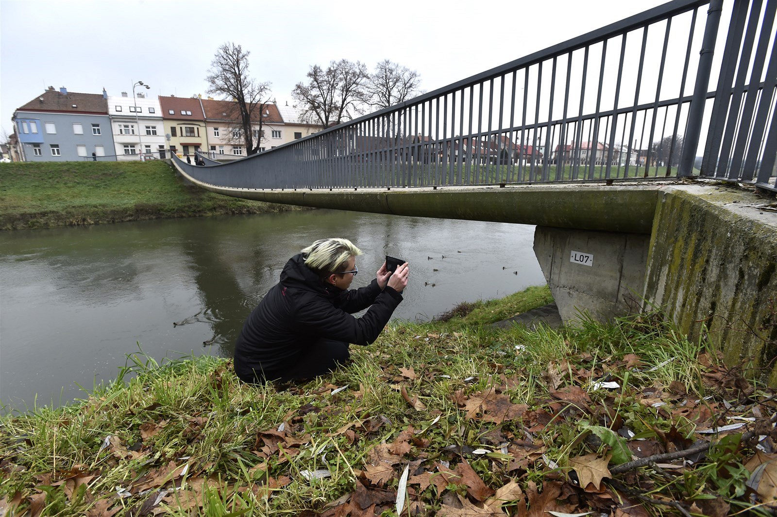 Mimořádná kontrola lávky přes řeku Moravu v Kroměříži.