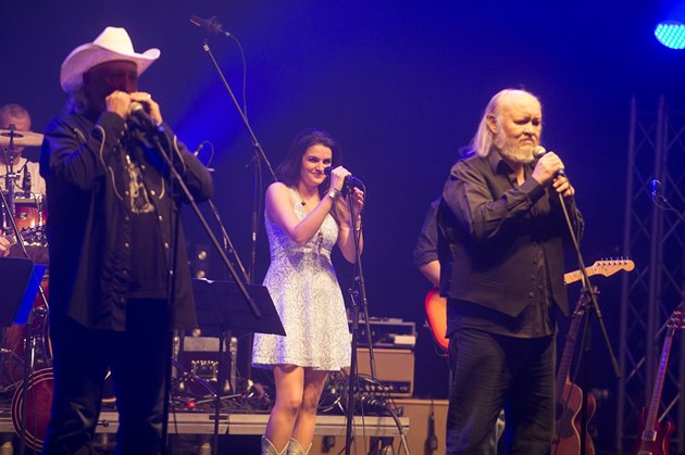 Tomáš Linka, František Segrado a Klára Tibitanzlová na galakoncertu pro Michala Tučného (Lucerna, Praha, 4. dubna 2017)