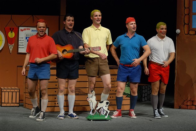 Rychlé šípy v podání herců Slováckého divadla v Uherském Hradišti. Na snímku zleva jsou Tomáš Šulaj (Rychlonožka), Petr Čagánek (Jarka Metelka), David Vacke (Mirek Dušín), režisér Robert Bellan (zde zaskakující v roli Červenáčka) a David Vaculík (Jindra Hojer).