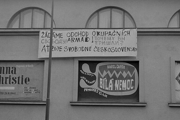 Fasáda Slováckého divadla při dramatických okamžicích během sovětské okupace v srpnu 1968.
