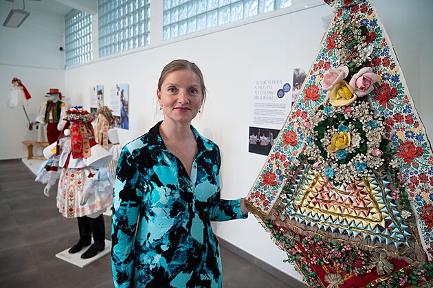 Výstava Klenoty lidové kultury Zlínského kraje ve Slováckém muzeu v Uherském Hradišti. Na snímku kurátorka výstavy Marta Kondrová (duben 2025)
