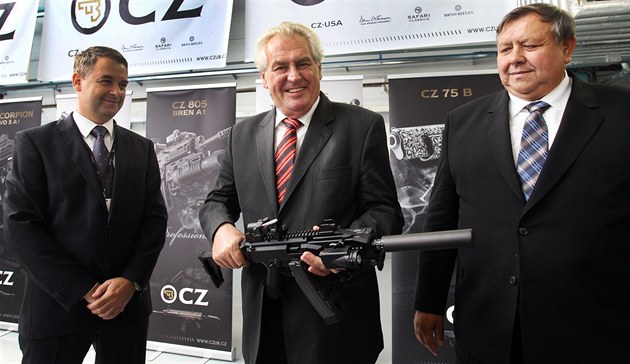 Prezident Miloš Zeman a hejtman Zlínského kraje Stanislav Mišák při návštěvě České zbrojovky v Uherském Brodě.