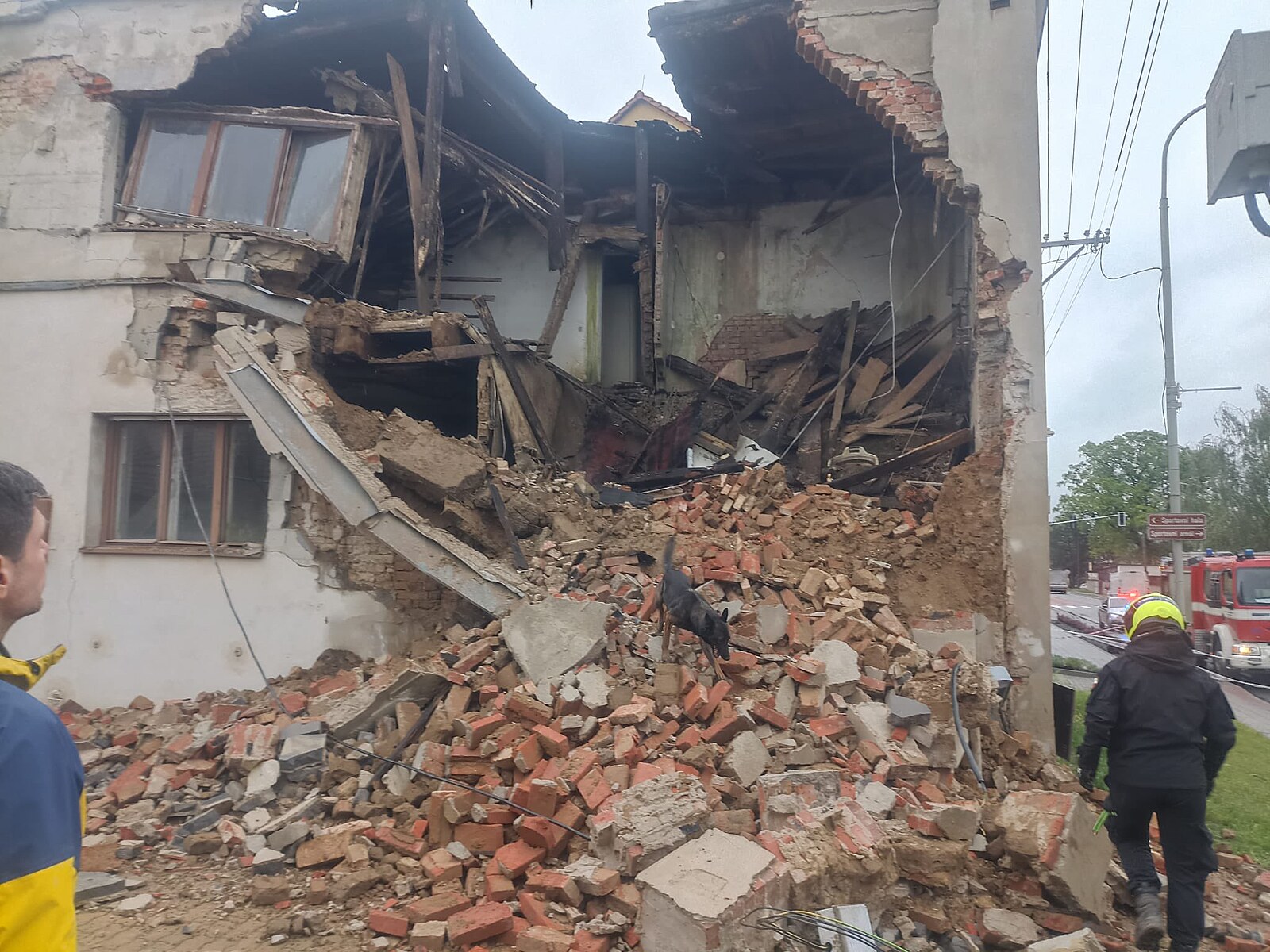 Ve Spytihněvi se zřítila zeď neobydleného domu, událost komplikuje dopravu. (květen 2023)