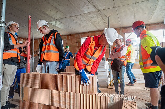 Studenti základních a středních škol na Uherskobrodsku se v rámci akce Jak roste dům přišli podívat na stavbu bytovky v Uherském Brodě. Mohli si vyzkoušet práci zedníka, tesaře, instalatéra nebo třeba bagristy. (září 2025)