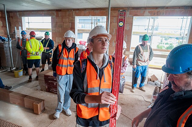 Studenti základních a středních škol na Uherskobrodsku se v rámci akce Jak roste dům přišli podívat na stavbu bytovky v Uherském Brodě. Mohli si vyzkoušet práci zedníka, tesaře, instalatéra nebo třeba bagristy. (září 2025)