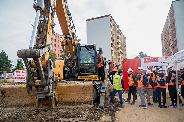 Studenti základních a středních škol na Uherskobrodsku se v rámci akce Jak roste dům přišli podívat na stavbu bytovky v Uherském Brodě. Mohli si vyzkoušet práci zedníka, tesaře, instalatéra nebo třeba bagristy. (září 2025)