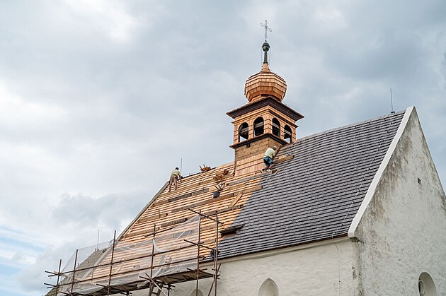 V Tečovicích opravují šindelovou střechu kostela. (srpen 2025)