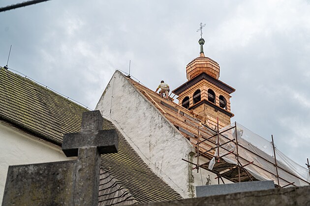 V Tečovicích opravují šindelovou střechu kostela. (srpen 2025)