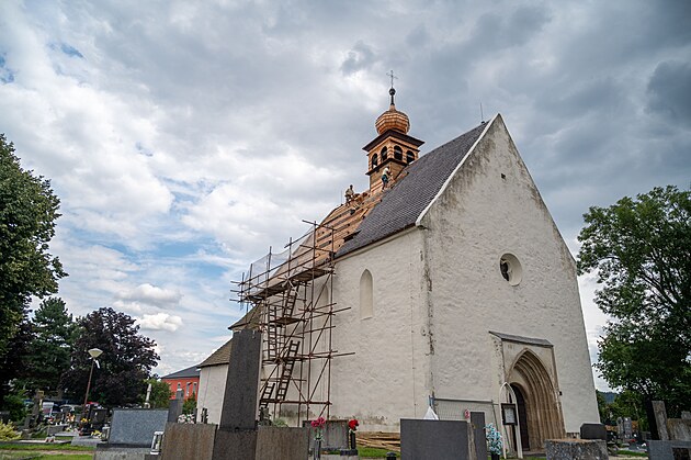 V Tečovicích opravují šindelovou střechu kostela. (srpen 2025)