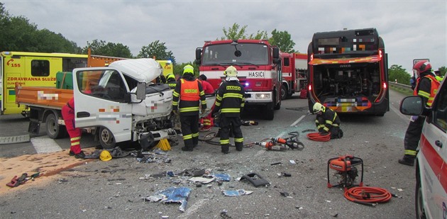 Vážně zraněného řidiče dodávky museli hasiči vyprostit, protože zůstal po nárazu zaklíněný ve voze.