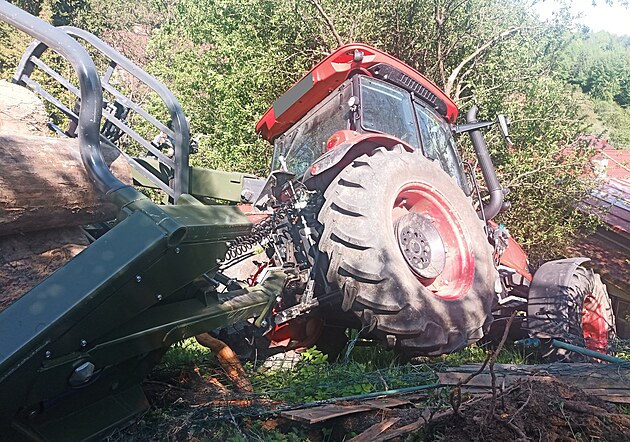 Převrácený traktor se dřevem v obci Prlov na Vsetínsku poškodil plynovou přípojku. (květen 2025)