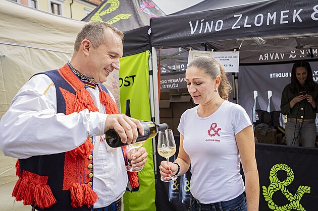 Vinaři ze Slovácké vinařské podoblasti nabídli návštěvníkům slavností vína v Uherském Hradišti první výsledky své práce v podobě burčáku. Letošní sezonu očekávají úspěšnou, s vyšším výnosem a vysokou kvalitou. Na snímku vinař Libor Zlomek z vinařství Zlomek a Vávra z Boršic u Blatnice. (září 2025)