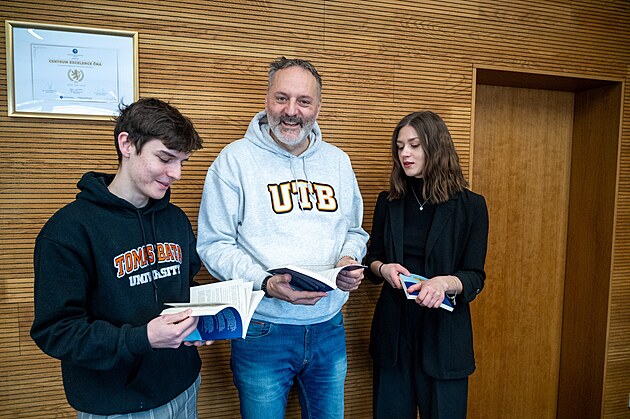 Studenti zlínské Univerzity Tomáše Bati Andrea Ladnerová a Tomáš Skála napsali knihu Neboj se peněz! Jde o praktického průvodce financemi pro mladé. Na snímku uprostřed je děkan Fakulty Managementu a Ekonomiky Michal Pilík. (leden 2026)