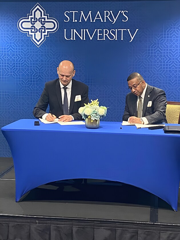 Memorandum o vzájemné spolupráci podepsali rektor Univerzity Tomáše Bati Milan Adámek (vlevo) a prezident St. Mary’s University Winston Erevelles.