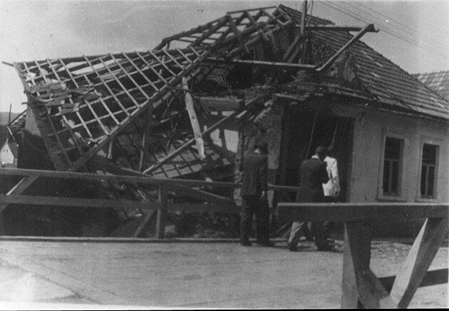 Dům Josefa Kostky poškozený při destrukci mostu v dubnu 1945.
