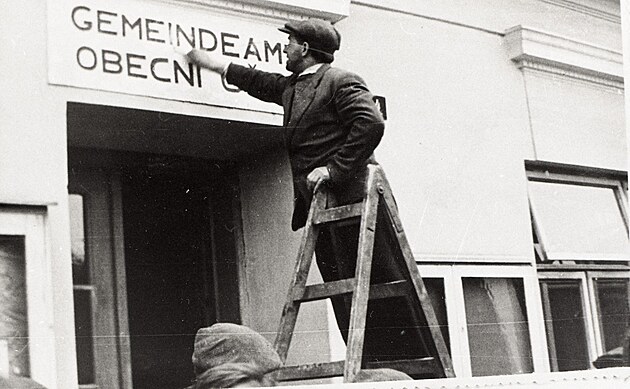Po osvobození 6. května 1945 byly odstraňovány všechny německé nápisy a vývěsní štíty.