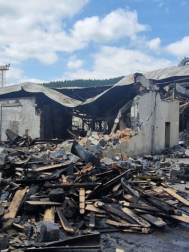 Hasiči i druhý den zůstávají na požářišti pily na zpracování dřeva ve Velkých Karlovicích. (17.červen 2025)