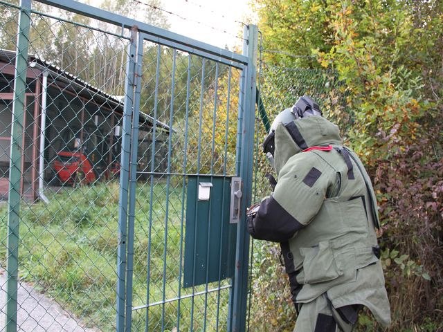 Pyrotechnici ve speciálních oblecích prozkoumávají areál muničního skladu ve Vrběticích.