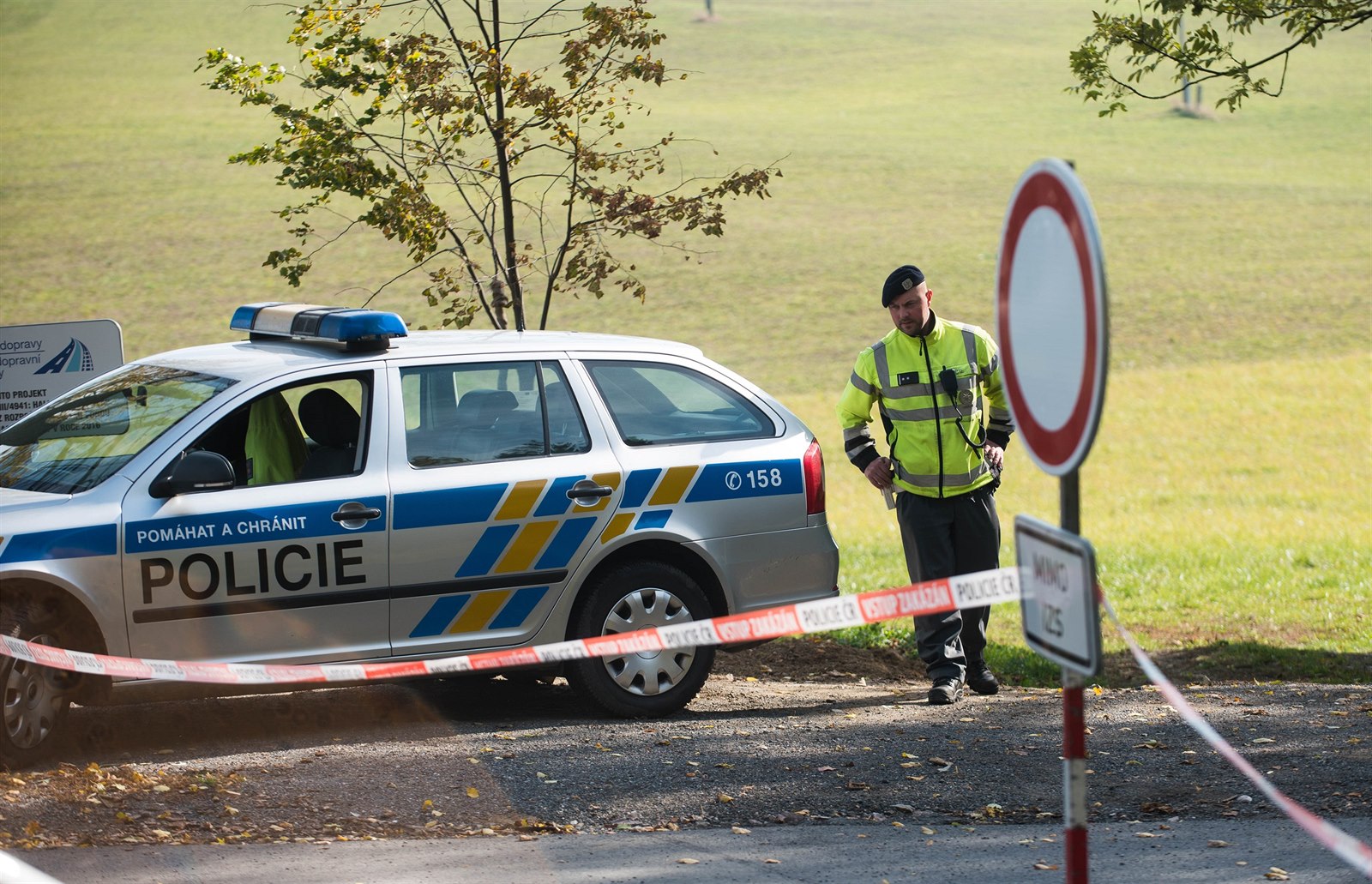 Okolí areálu s muničními sklady u Vrbětic střeží desítky policistů. (8. prosince 2014)