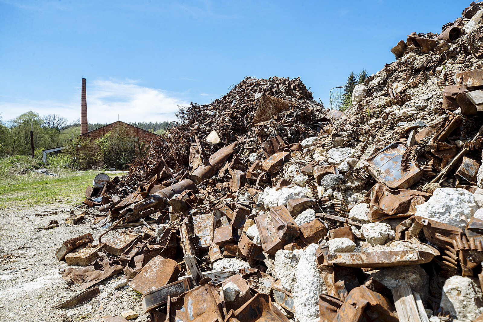 Na několika hromadách je k vidění změť zničeného vojenského materiálu, od zbytků samopalu, kulometů a munice po zbytky zdiva (2021).