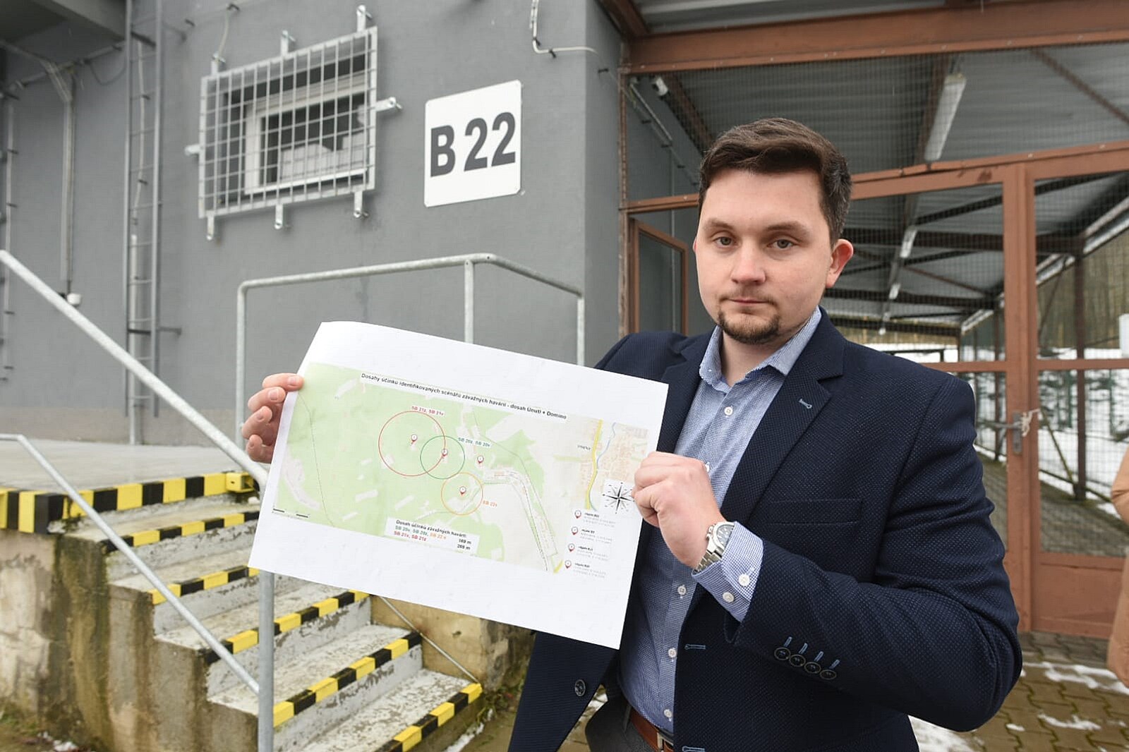Firma Colt CZ představila objekt v muničním skladu ve Vlachovicích, kde chce vyrábět granáty. Na snímku ředitel úseku muničních systémů Michal Frejlich ukazuje mapu rizika možného ohrožení při krizových situacích. (únor 2023)