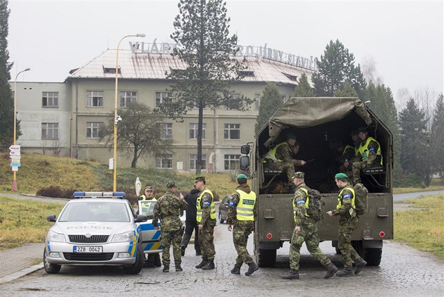 K bývalým Vlárským strojírnám přijelo auto plné vojáků, na dalším postupu se domlouvali s policisty. (3. 12. 2014)