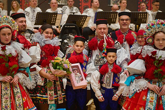 Vlčnovským králem pro rok 2025 je jedenáctiletý František Dacík. Na snímku s panenkou František, vedle bratr Marek a rodiče Marie a Marek. (leden 2025)