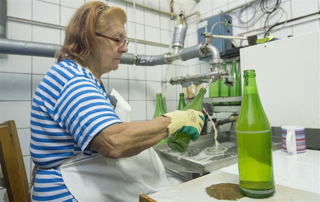 „Při chladnutí se vytvoří podtlak, to je pak jistota, že mošt vydrží,“ ukazuje Marta Klimentová. Sedí u plničky a rukama jí prochází jedna láhev za druhou.