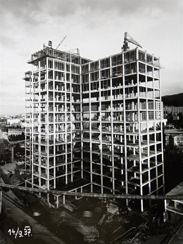 Železobetonový skelet mrakodrapu postavilo 40 dělníků se čtyřmi jeřáby za 160 dnů.
