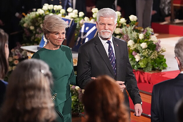Prezident Petr Pavel přichází s manželkou na předávání státních vyznamenání. (28. října 2025)