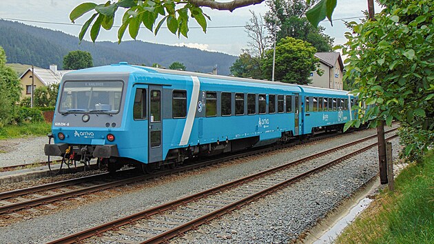 Motorová jednotka Arrivy čeká ve Velkých Karlovicích na zpáteční jízdu do Vsetína.