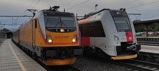 Souprava RegioPanter ČD v barvách PID na nádraží v Kolíně na souběžné koleji se soupravou RegioJet